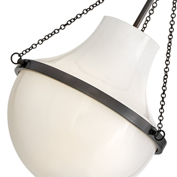 Fusing a sculpted, modern form with classically styled details, Collins features a transitional teardrop shade crafted from blown, cased opal glass. A central metal band and delicate chain uprights are available in Heritage Brass or Black Oxide finishes.