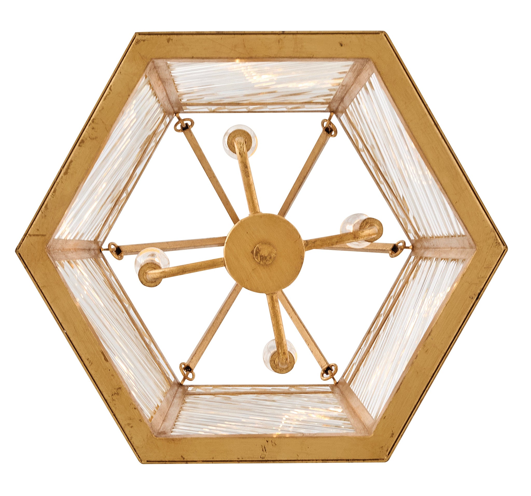 A reimagining of vintage designs from the 40s and 50s, Sura’s transitional, hexagonal Distressed Brass frame creates a glamorous yet understated and tailored appeal. Cylindrical glass rods set at alternating angles echo a soft herringbone pattern, juxtaposing geometry within geometry. Layered details create a reeded effect that is reflective and alluring.