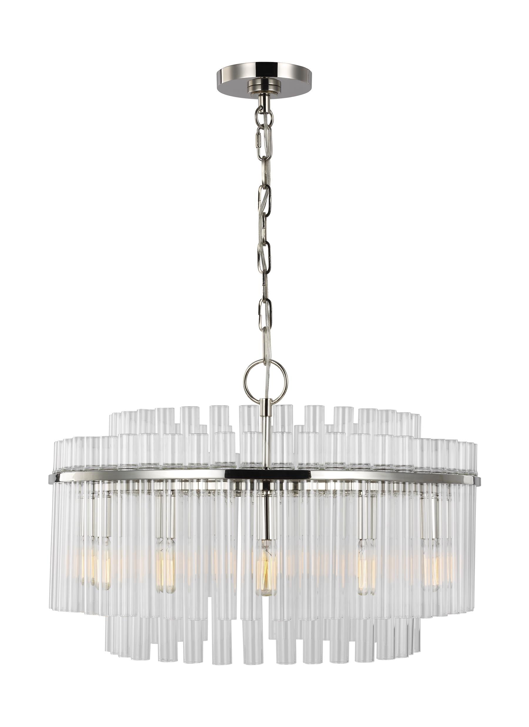 The Beckett family from Chapman & Myers presents Art Deco forms with a modern minimalist sensibility. Drum silhouette adds a glamorous Art-Deco spin on the chandelier. Cascading glass tubes surround exposed bulbs and is available in two finishes: Burnished Brass and Polished Nickel.