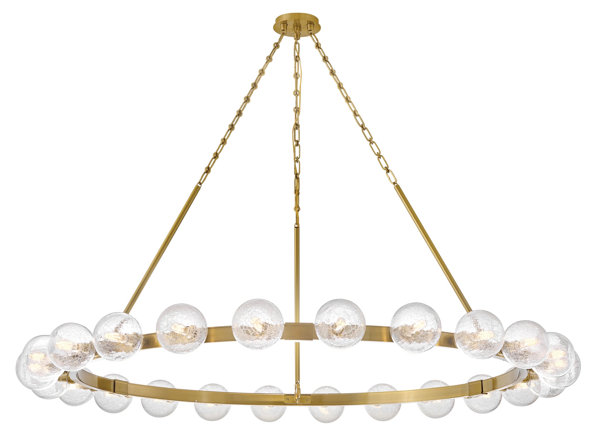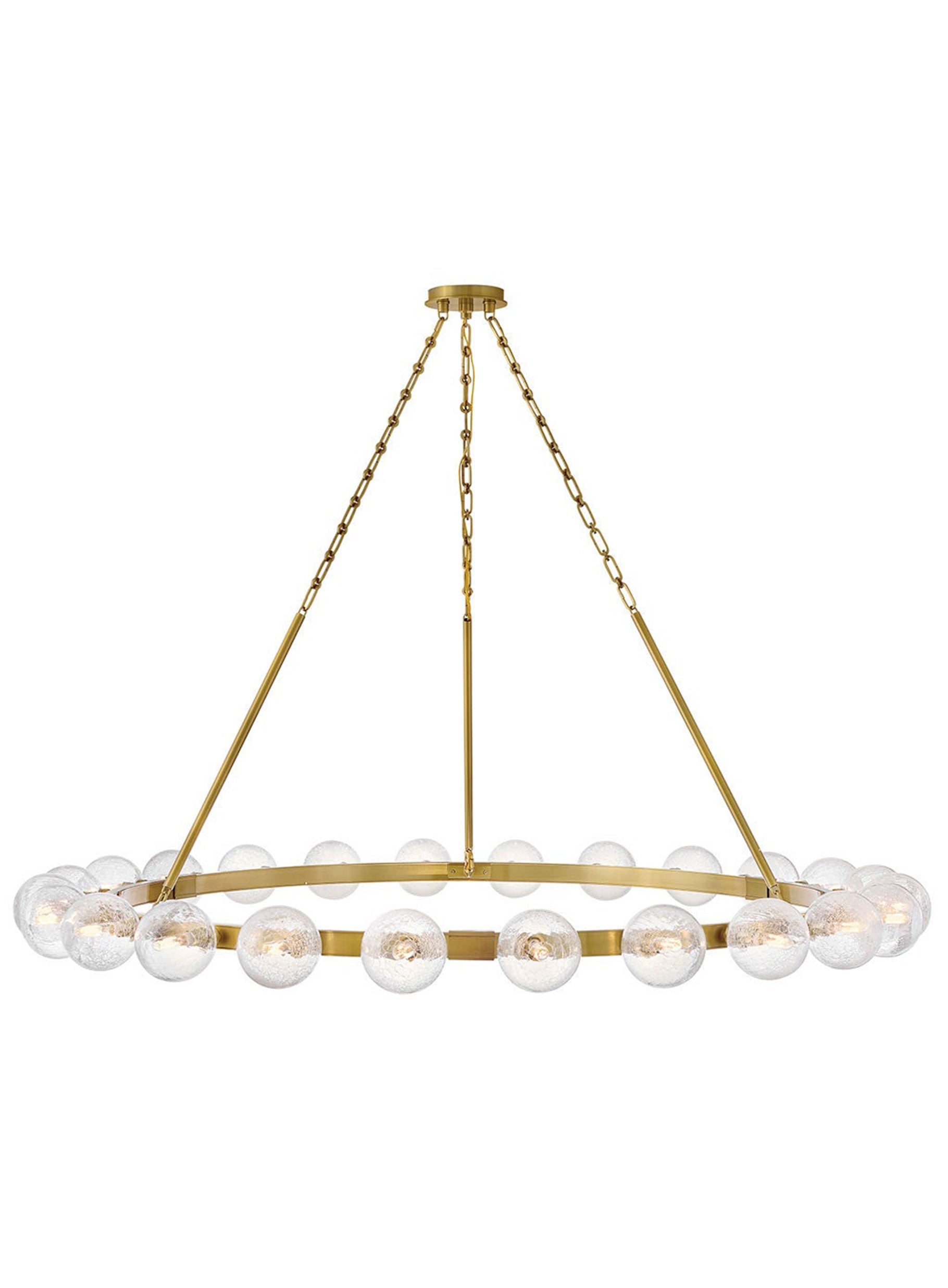 Dramatic crackled glass globes surround Coco's timeless silhouette with unexpected, distressed detailing. Minimal framing suspended from decorative stem-to-chain uprights features a warm and inviting Lacquered Brass finish.