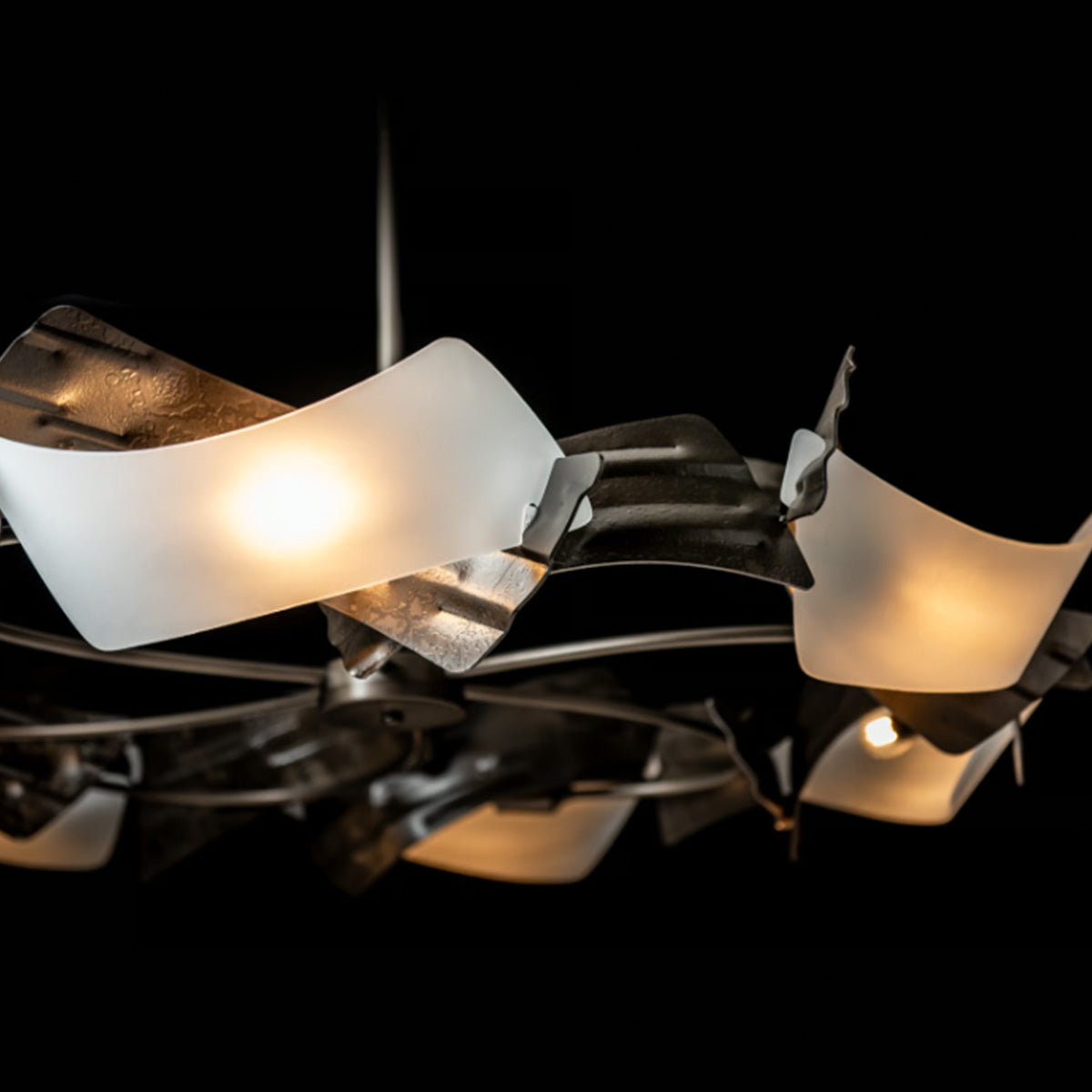 Designer Jason Hancock was inspired by the rolling waves of the sea, easily seen in the Crest Circular Pendant that embodies that essence of both strength and grace. Its hammered steel pattern, curved plates and art glass create a sense of ebb and flow with six lights illuminating the space.