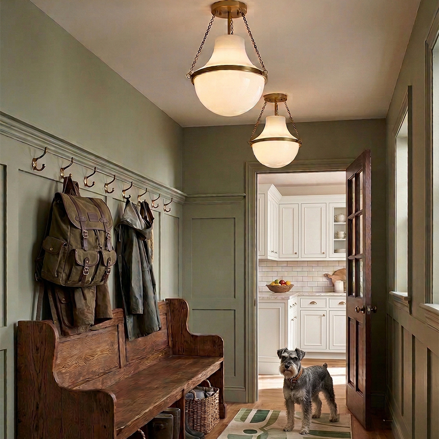 Fusing a sculpted, modern form with classically styled details, Collins features a transitional teardrop shade crafted from blown, cased opal glass. A central metal band and delicate chain uprights are available in Black Oxide, Heritage Brass, or Polished Nickel finishes.