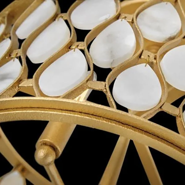 Opulently adorned with natural alabaster stones held within a traditional latticework shade, Estie brings organic elegance to any aesthetic. Intricately curved metalwork complements the frame, chain, and canopy in a textured Piastra Gold finish.
