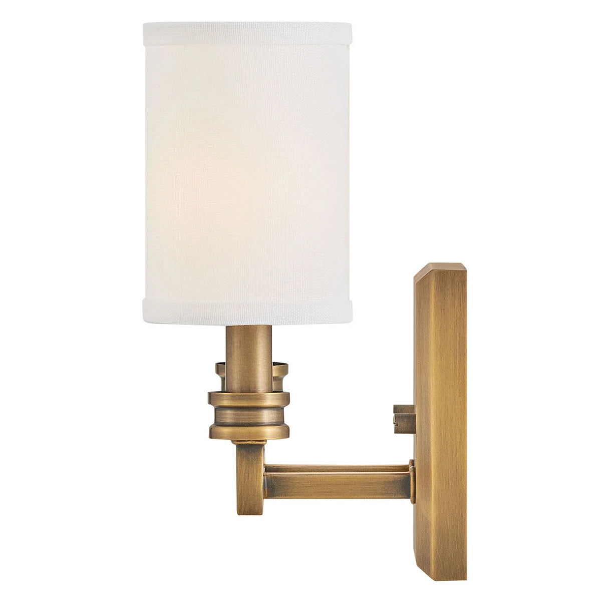 A modern interpretation of traditional torch sconces, Moore's square stems and beveled back plate are complemented by decorative cast details. Off-white linen shades accentuated by top and bottom binding create a sophisticated, tailored look.