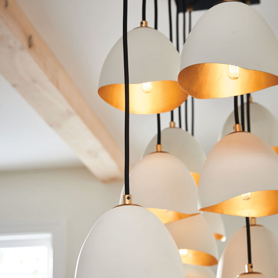 Nula is a work of art. A juxtaposition of industrial elements and organic influencers transmutes simplicity into decadence. Pairing a dense Shell Black or Shell White exterior with a gleaming, gold leaf interior elicits a dramatic effect. Several designs offer flexibility to customize for unique installations.