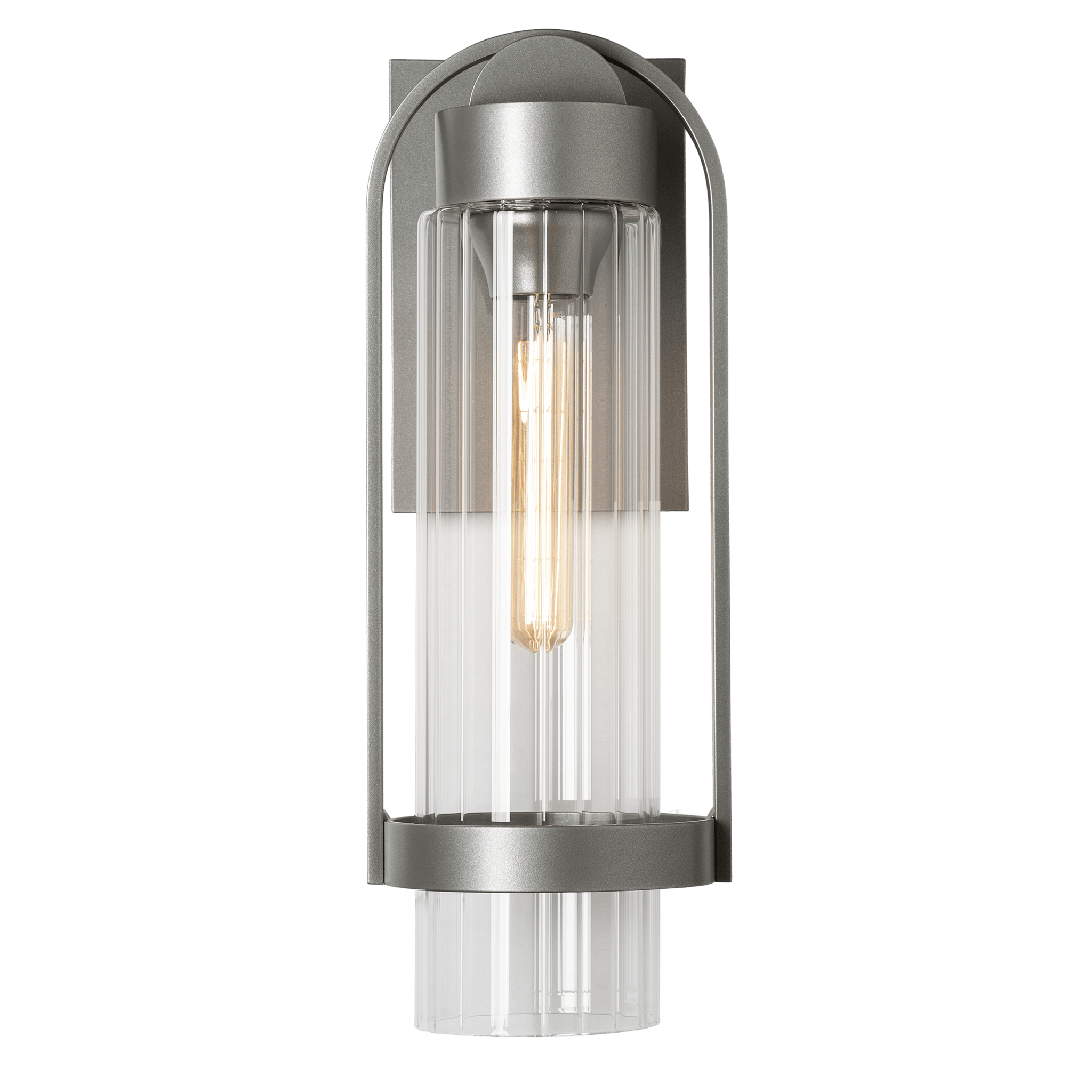 The Alcove Small Outdoor Sconce is a clean contemporary design that complements many architectural styles. The clear fluted glass disperses light in a subtle pattern, while the clean elemental forms made of hand-shaped aluminum are unified into a single, elegant form. This sconce is perfect for may outdoor applications where smaller-sized wall fixtures are optimal. Choice of clear fluted or frosted glass.