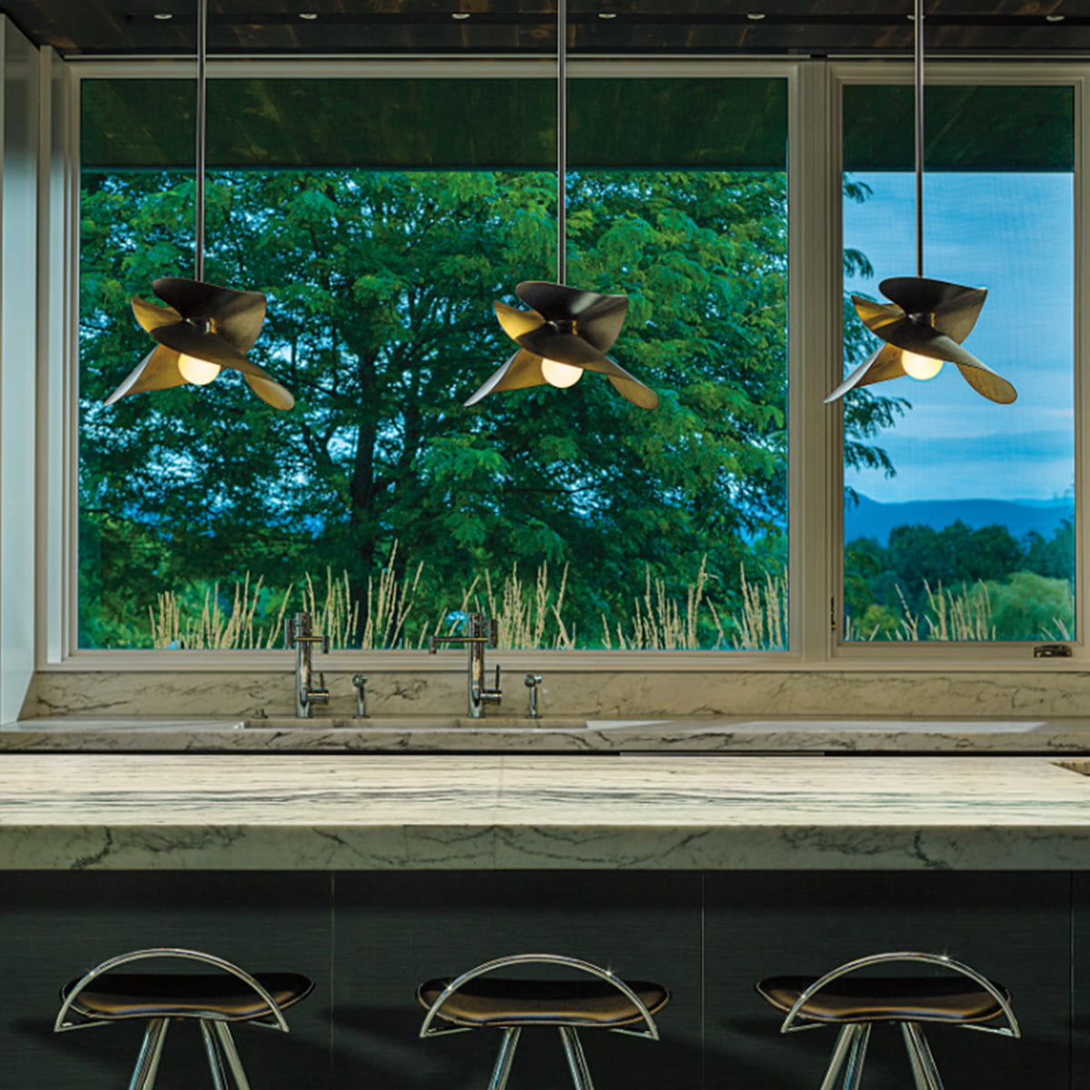The Hibiscus Pendant puts Hubbardton Forge makers metalcrafting skills on full display. Beautifully textured metal "petals" from the heat of the forge embrace the light below. The Hibiscus Small version just over 15" in width, perfect to hang in multiples over a kitchen island or bar, and versatile enough to hang singly in other spaces. Also available in a larger size, as well as an outdoor pendant option.