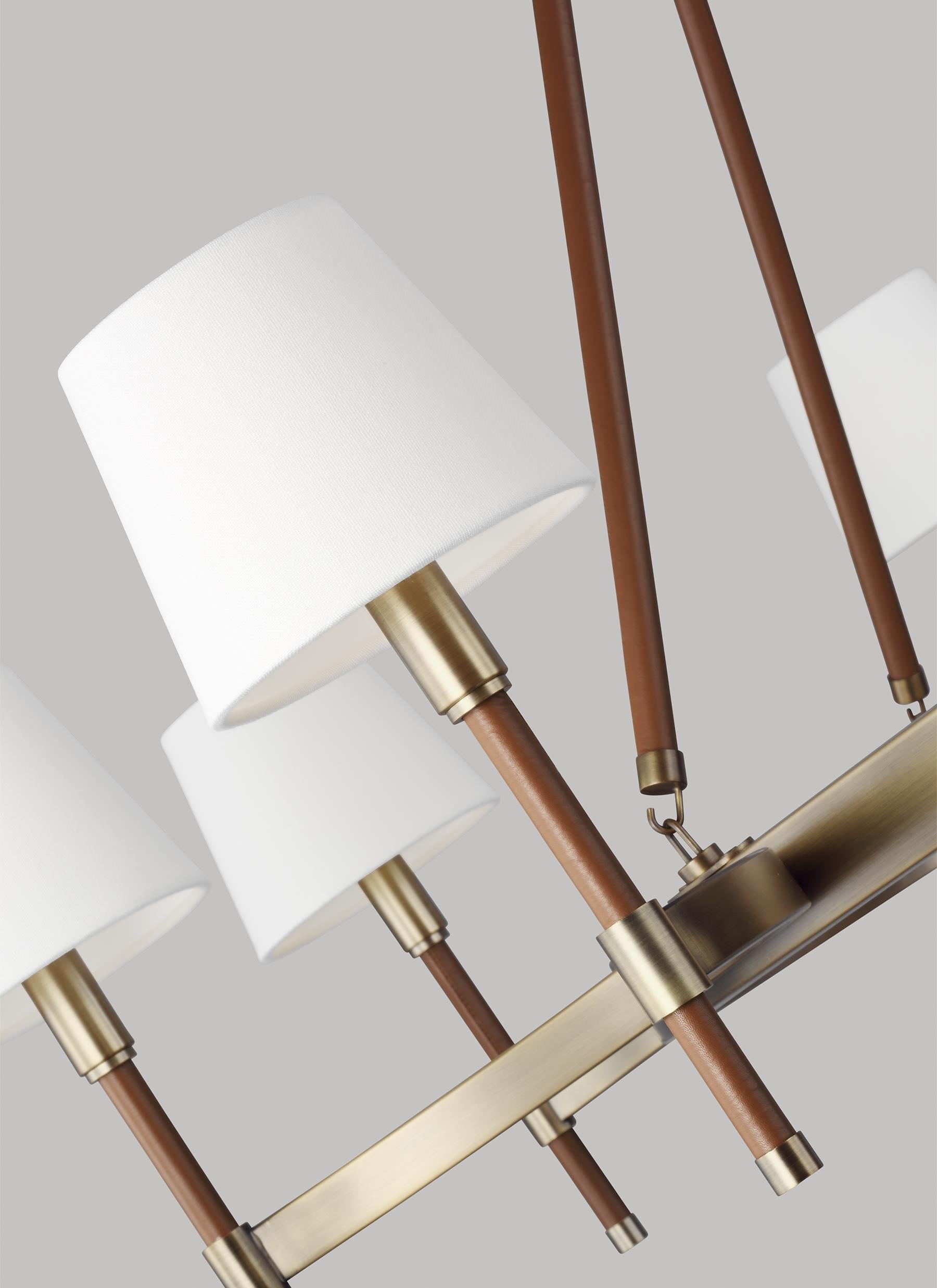 Katie Large Chandelier from Lauren Ralph Lauren for Generation Lighting has real hand-stitched leather accents and white linen fabric shades.
