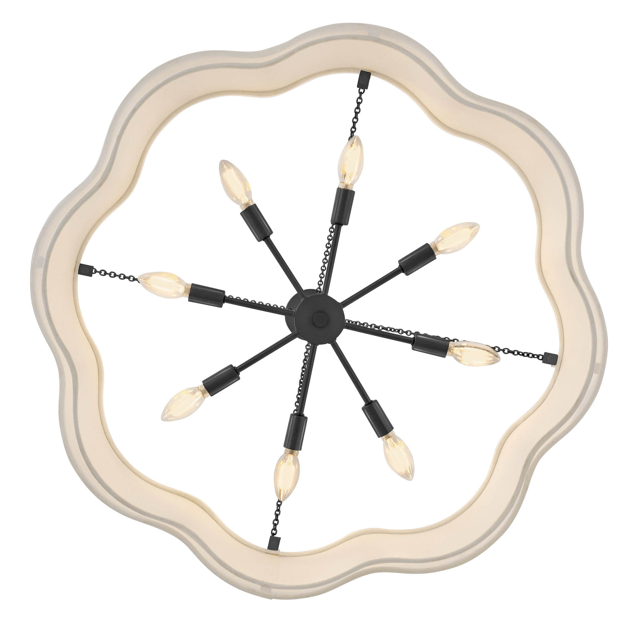 Splendidly soft, Gwen’s shapely scalloped shade complements inviting light with elegant layers of off-white linen suspended from delicate chains and minimal metal stems. A Black or Lacquered Brass finish provides a versatile complement to any interior style.