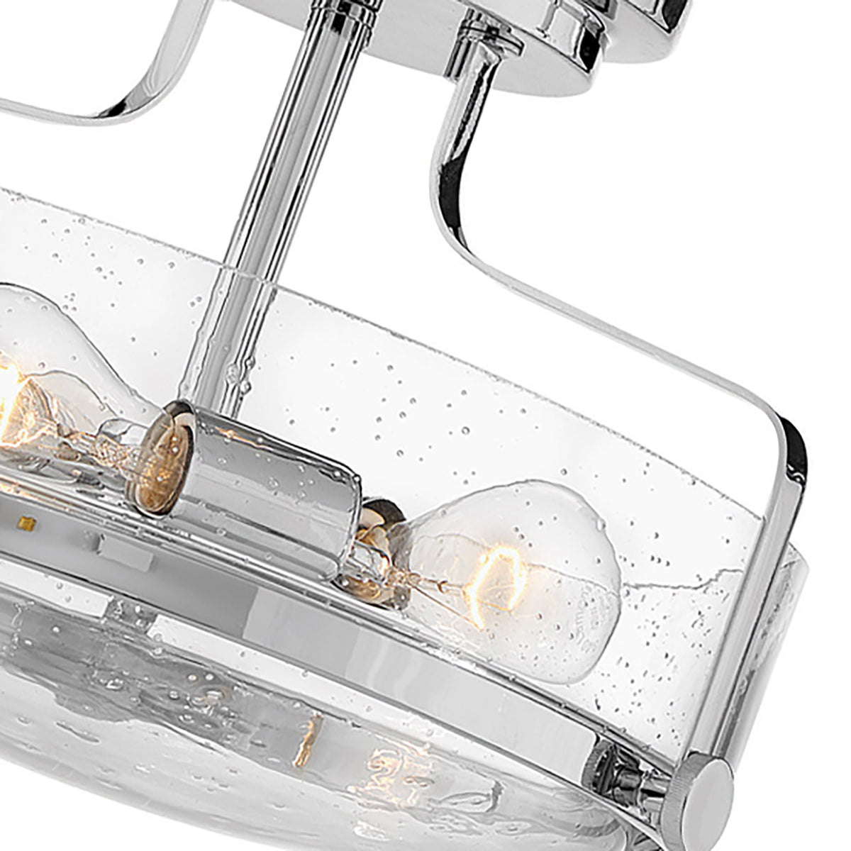 Harper’s sleek, retro design elevates the traditional flush mount with a unique clear seedy glass bound by a prominent metal ring and decorative knobs available in four finishes.