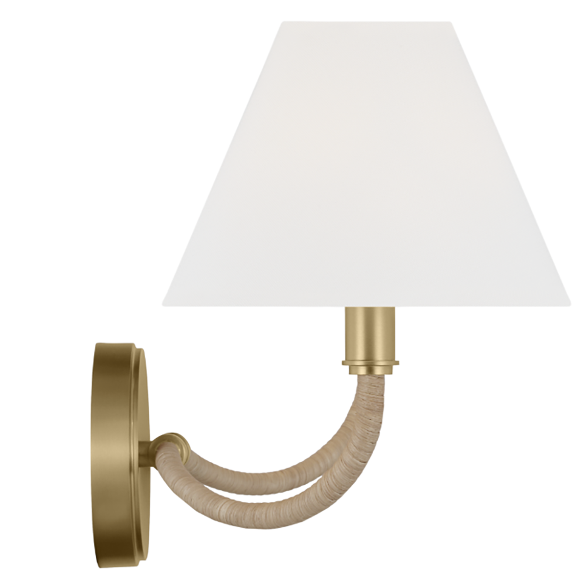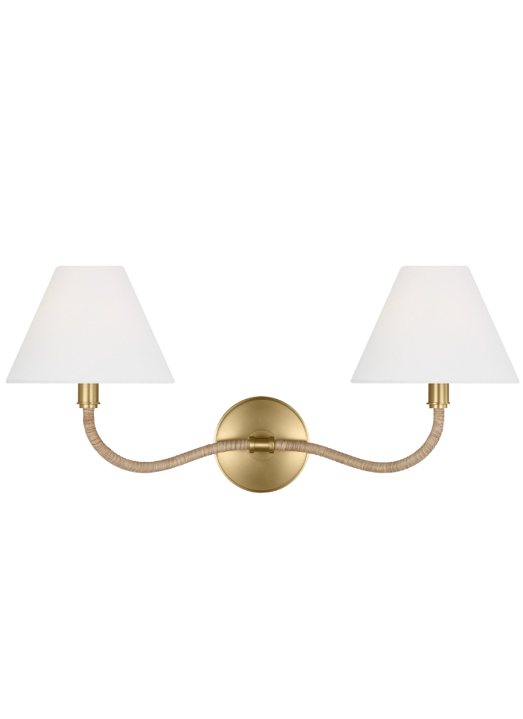 Traditional meets modern in the Laguna collection from Chapman & Myers for Visual Comfort Studio. With Blond rattan accents, tapering curved delicate arms and broad brimmed White Linen shades, the contemporary collection hints at old-world charm, with several chandeliers, sconces and a linear chandelier available in a Burnished Brass finish. This is a perfect collection to add elegance to any Modern Farmhouse aesthetic.