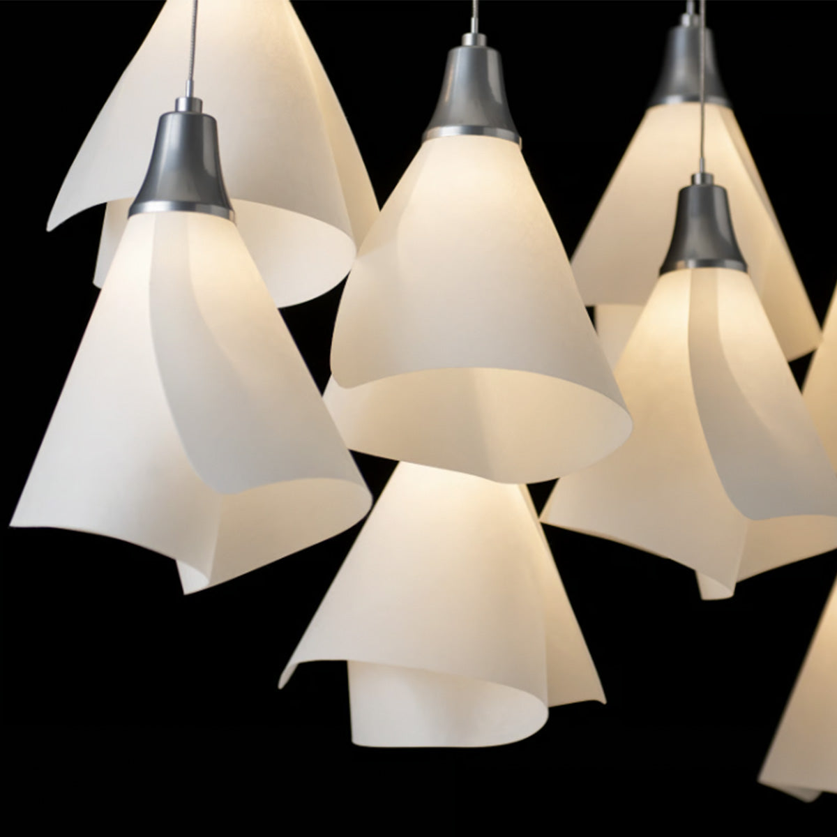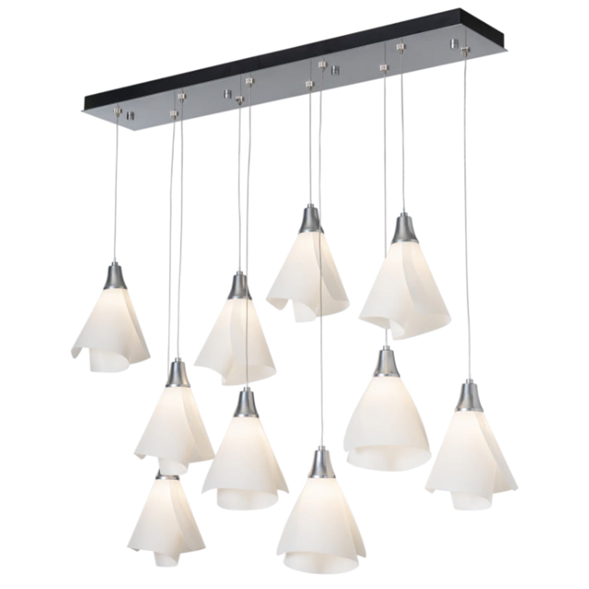 Graceful Mobius spun-frost shades seem to float in space from the rectangular canopy above. With the ability to customize each shade's positioning, whether you prefer the 10 lights to be aligned or staggered heights, the Mobius 10-Light fixture features a double linear multi-port.