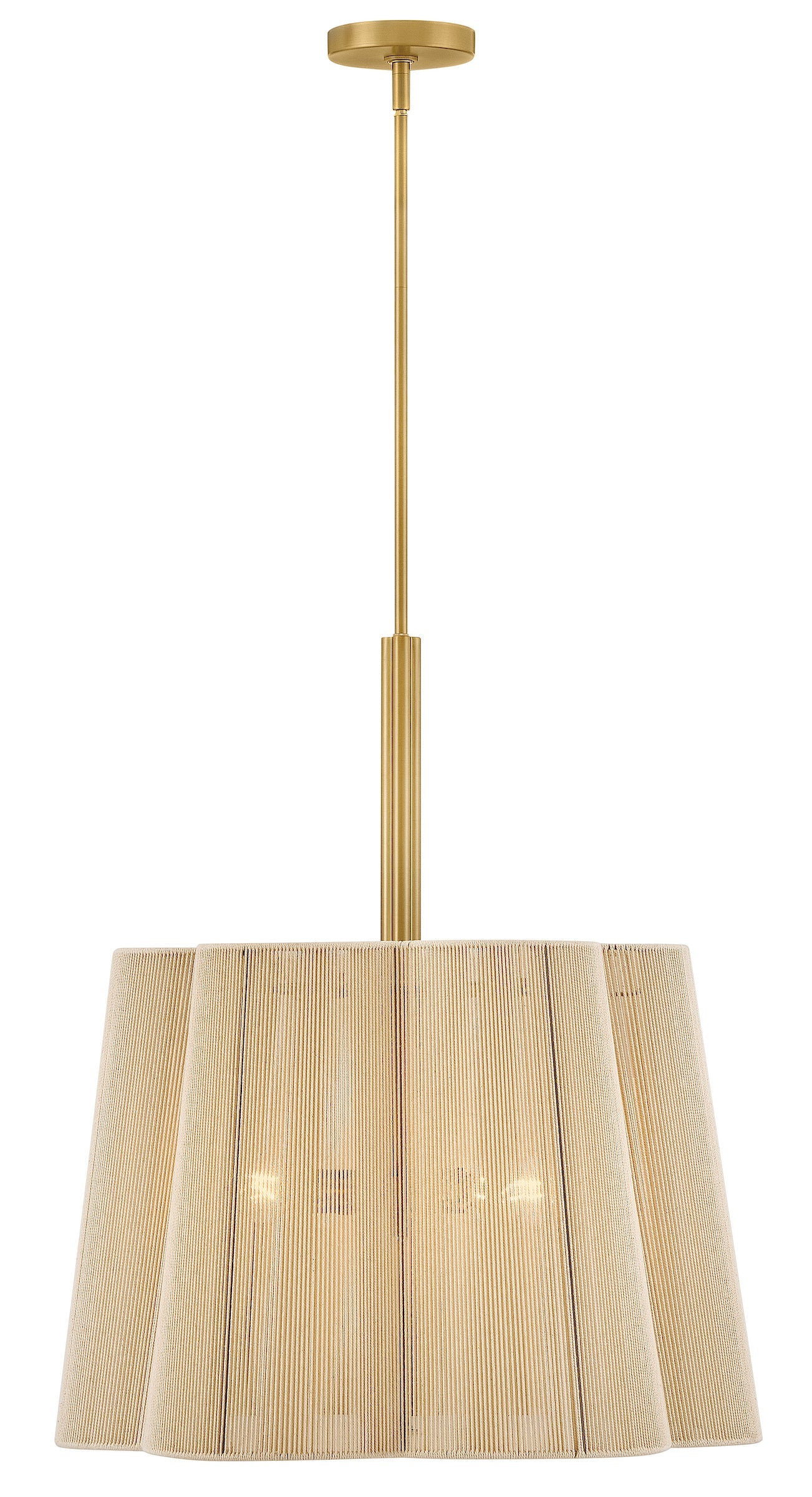 A chic yet casual décor statement infused with natural texture, Sasha’s subtly tapered, scalloped shade is hand-wrapped in natural-fiber cord, imparting an unexpected element of sheer softness to your décor. A clover-shaped Etched glass diffuser glows with welcoming illumination, secured by a complementing clover finial and a frame finished in Lacquered Brass.