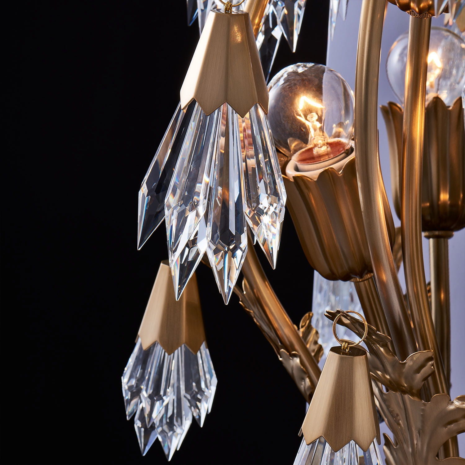 Elegant brass curves create a dynamic growth like movement, while crystal clusters evoke the beauty of morning dew on flower buds. Crafted with spear Firenze crystal tassels and cast solid brass, this unique fixture combines classical chandelier shapes with contemporary lightness in a Winter Brass finish.