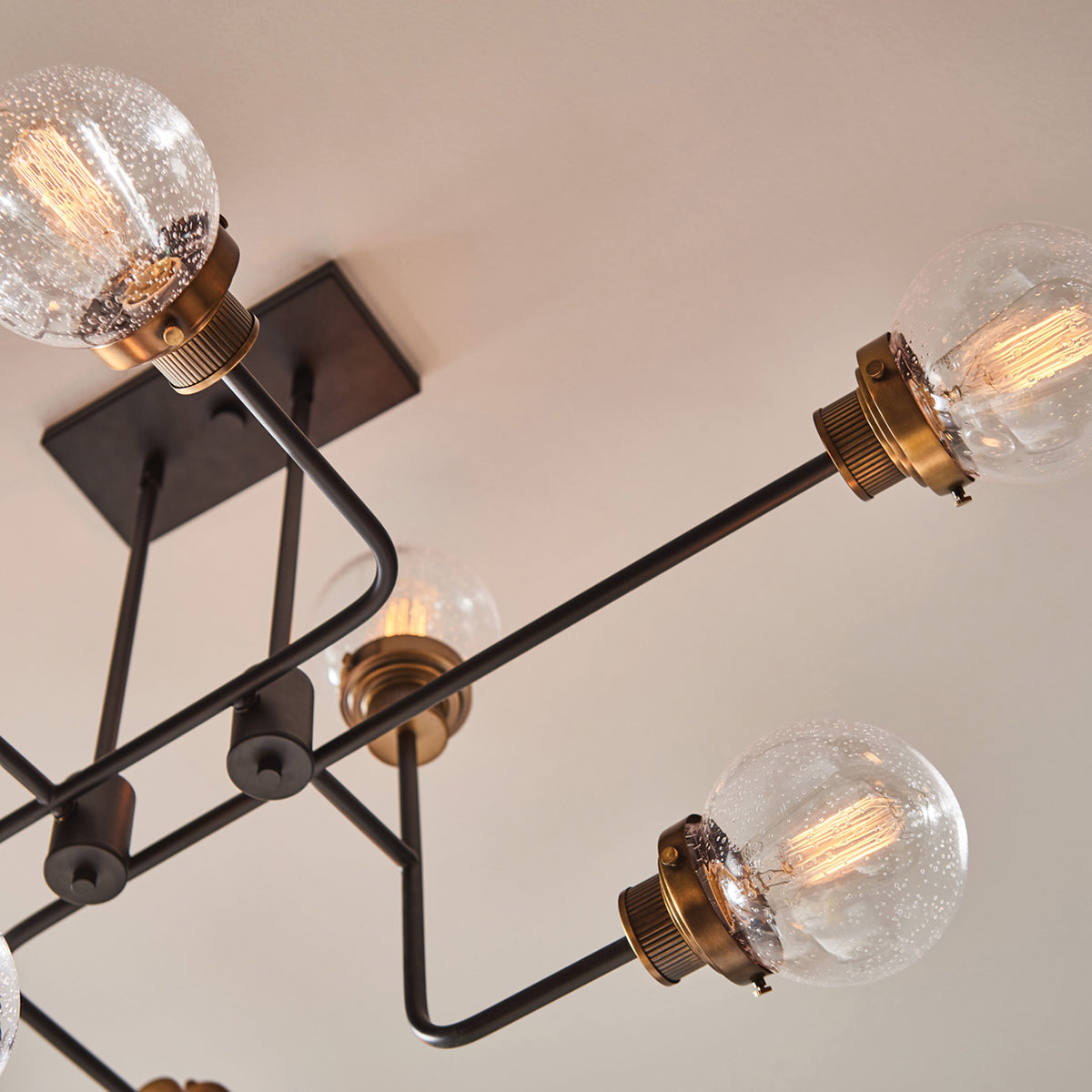 Poppy features clear seedy glass spheres that bubble out of refined, ribbed fitters to create a simple, yet sophisticated silhouette. The dual-finish combinations, Black with Brushed Nickel and Black with Heritage Brass, pair perfectly with a clean backplate or canopy and crisp crossbars to anchor this airy design. Poppy showcases mid-century style with a spectacular spin.