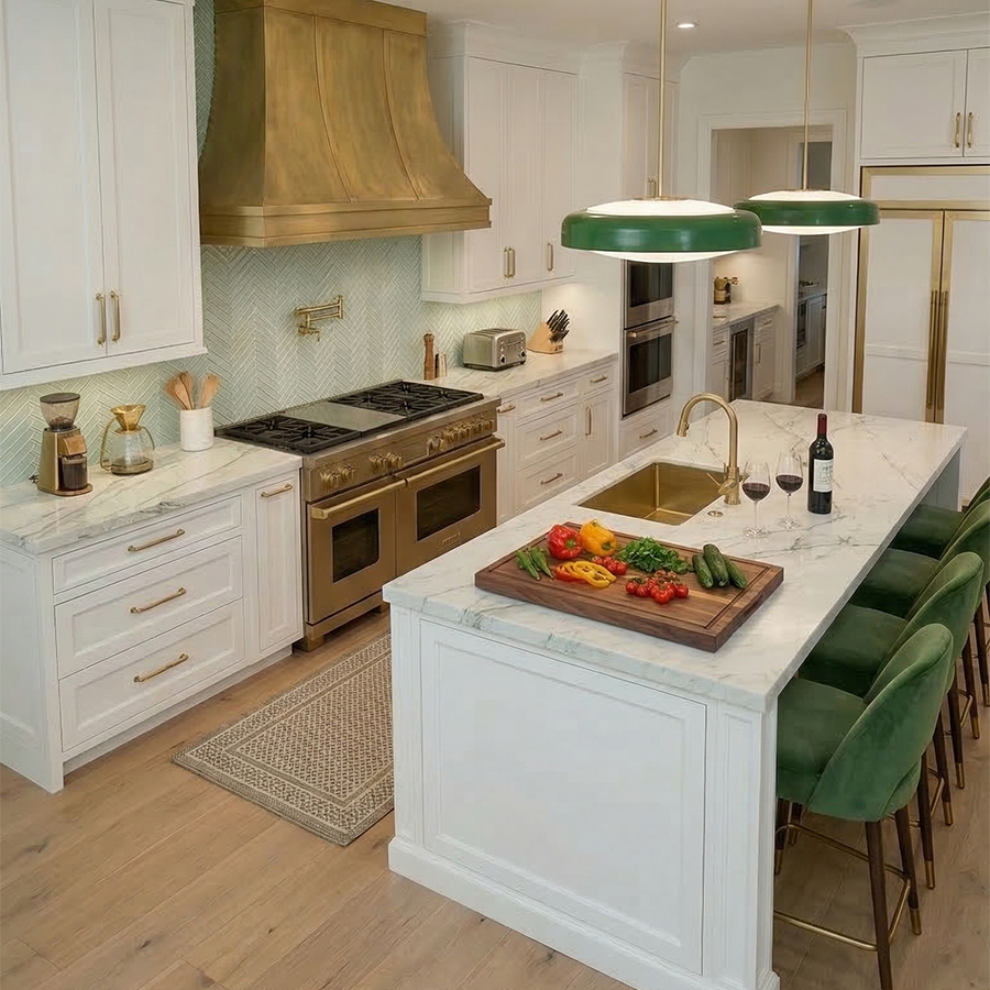 The Draper collection by Kate Spade offers a chic, striking combination of Burnished Brass, glossy Green or classic Midnight Black finish, each contrasted by a crisp white glass diffusers. Its wide, rounded metal shade is complemented by a slim, elegant stem, allowing the design to feel both contemporary and sophisticated. The Burnished Brass detailing adds a touch of refinement, making it perfect for a kitchen, dining area, or even as an accent piece in a larger room.