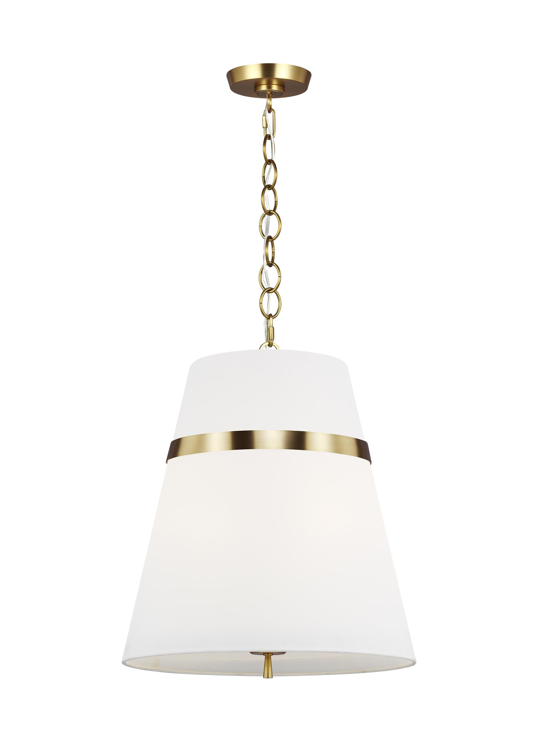 The simple, transitional Cordtlandt pendant by Alexa Hampton and flush mount series features a perfectly proportioned conical hanging shade with an optional metal band cinching it at the waist. Available in an Aged Iron, Burnished Brass or Polished Nickel finish.