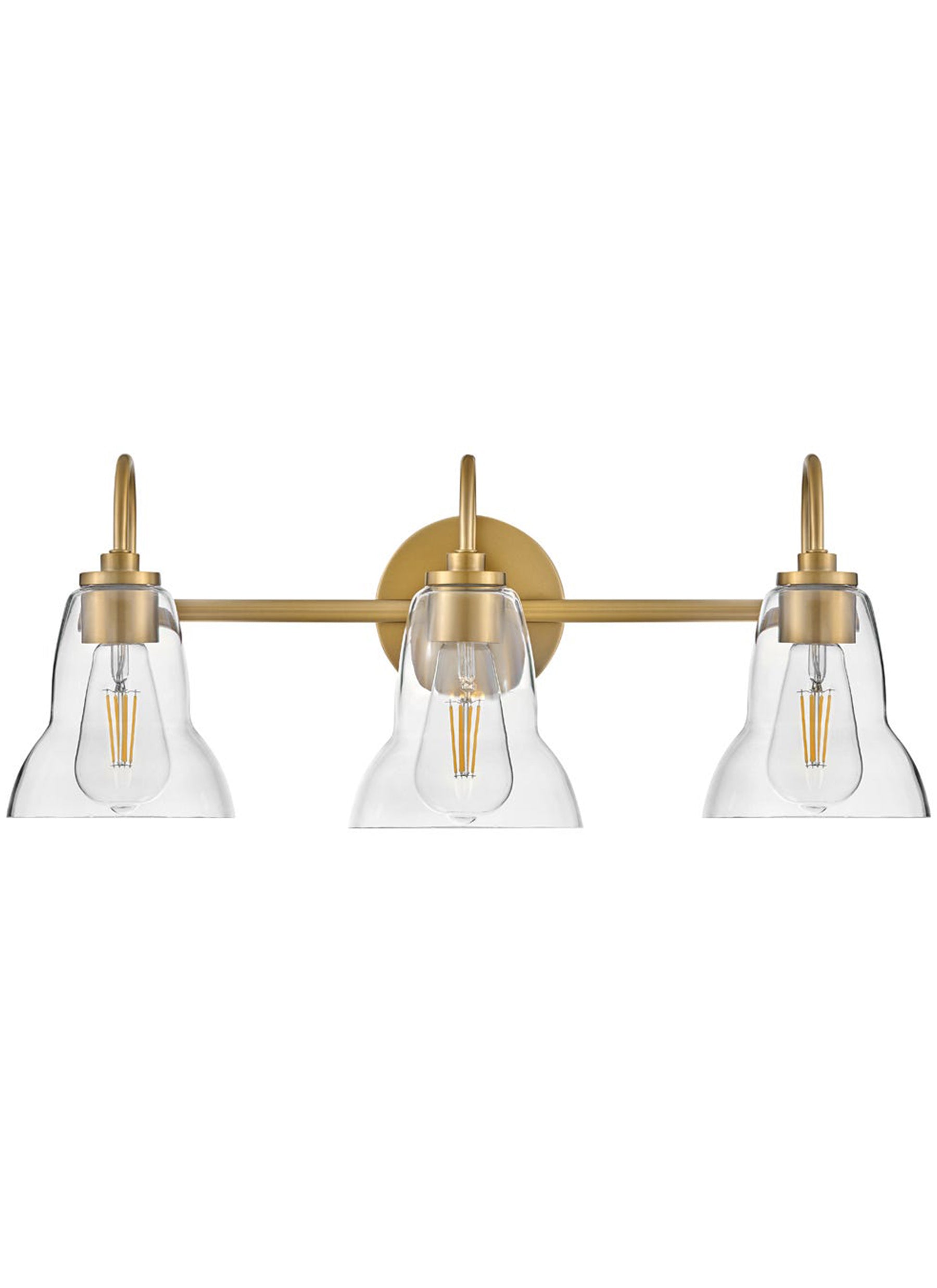 Vera's unique, shapely form takes the traditional bell-shaped shades to a new level. Plenty of light shines up or down from the clear glass, making it a functional choice for main baths and powder rooms alike. Finished in Black or Lacquered Brass, Vera's chic profile brings transitional style to any space.