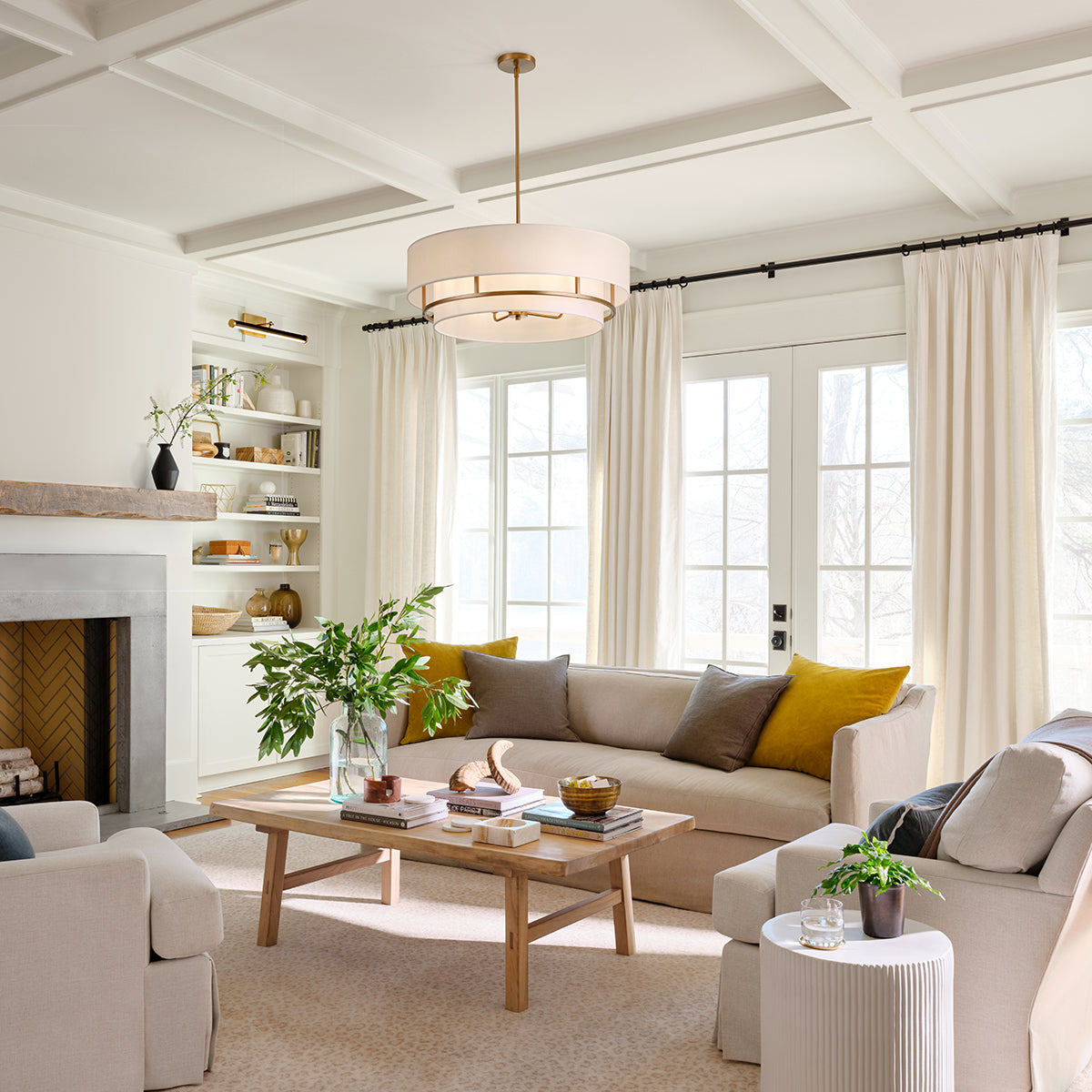 Handsome Graham is understated elegance, crafted with unique details making it the ultimate transitional semi-flush mount. Its welded frame is nestled between two off-white shades, in luminous faux parchment with a finished cluster visible from below. Graham is available in multiple finish options.