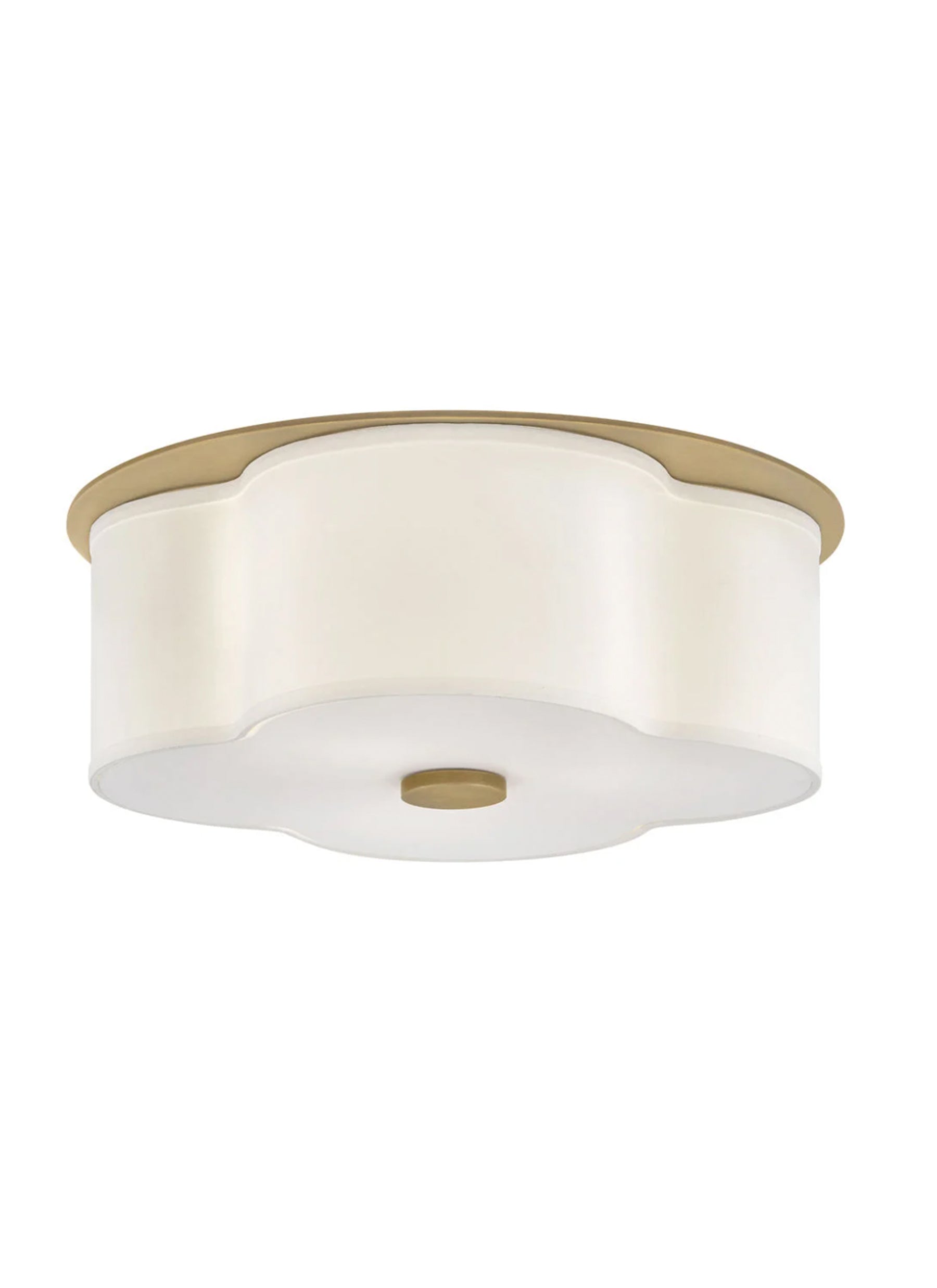 The curved quatrefoil silhouette of Delaney's off-white linen shade elegantly complements traditional aesthetics. Etched glass softly diffuses light, while an oversized decorative canopy in Heritage Brass or Black provides a subtle contrast.