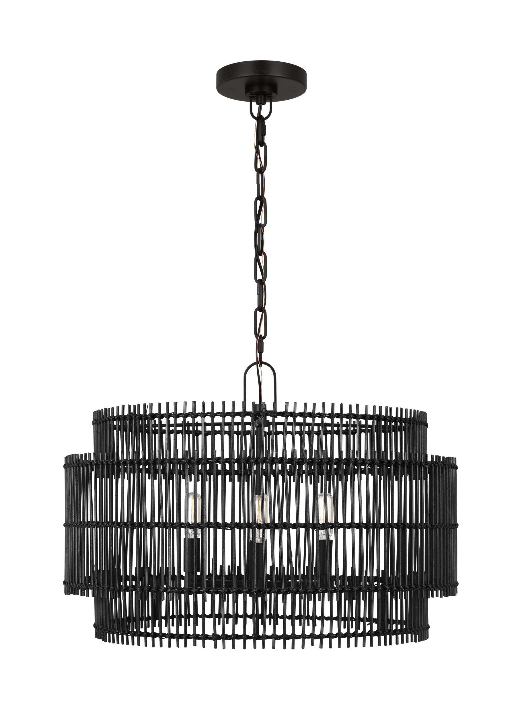 Have a large room with a high ceiling, the mid-century modern Elio chandelier by Ellen DeGeneres is perfect. The natural black bamboo structural shade and the chandelier's Aged Iron finish combines into one trendy look.