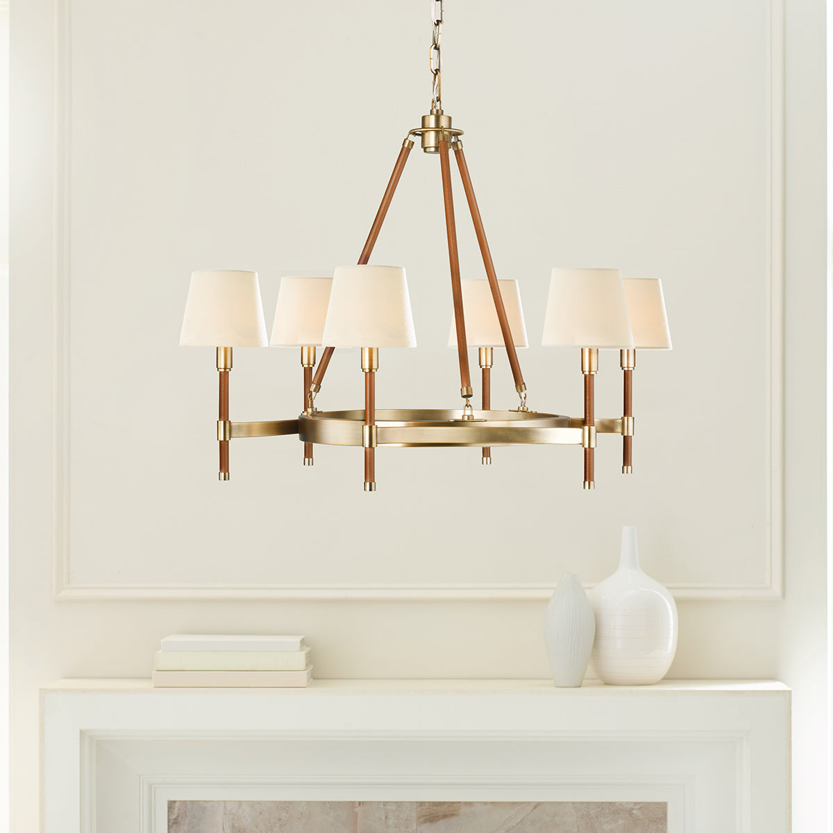 Lauren's Katie collection for Visual Comfort is elegant, updated with a fresh modern spirit. The combination of hand-stitched leather and polished nickel or time worn brass give this round chandelier equestrian flair, with white linen fabric shades.