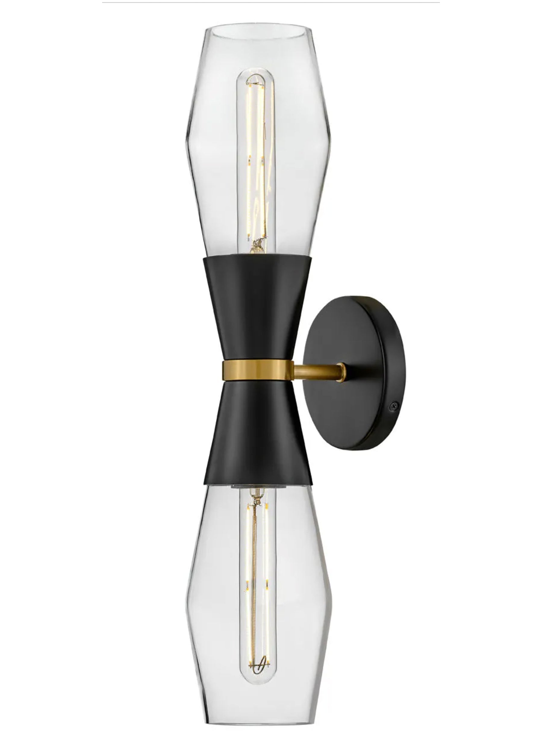 A geometric gem, Livie cleverly mixes sleek lines with an angular shape for a contemporary cool look that makes itself at home anywhere. Clear glass unites with spun metal elements in striking Black or luxe Lacquered Brass finish options to boldly underscore Livie's modern edge.