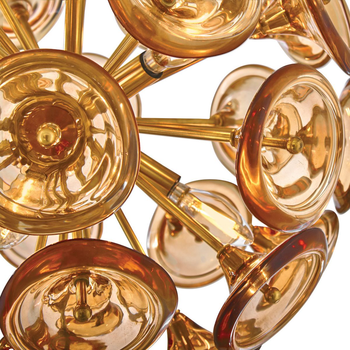 Capturing the essence of natural elegance seen through a contemporary lens, Maya’s hand-blown trumpet blossoms are artfully arranged in radiant bouquets to cast an enchanting aura. Intricate solid brass frames suspended from minimal stems and canopies are hand-painted in a chic Unlacquered Brass finish, adding a classic touch to your décor palette.