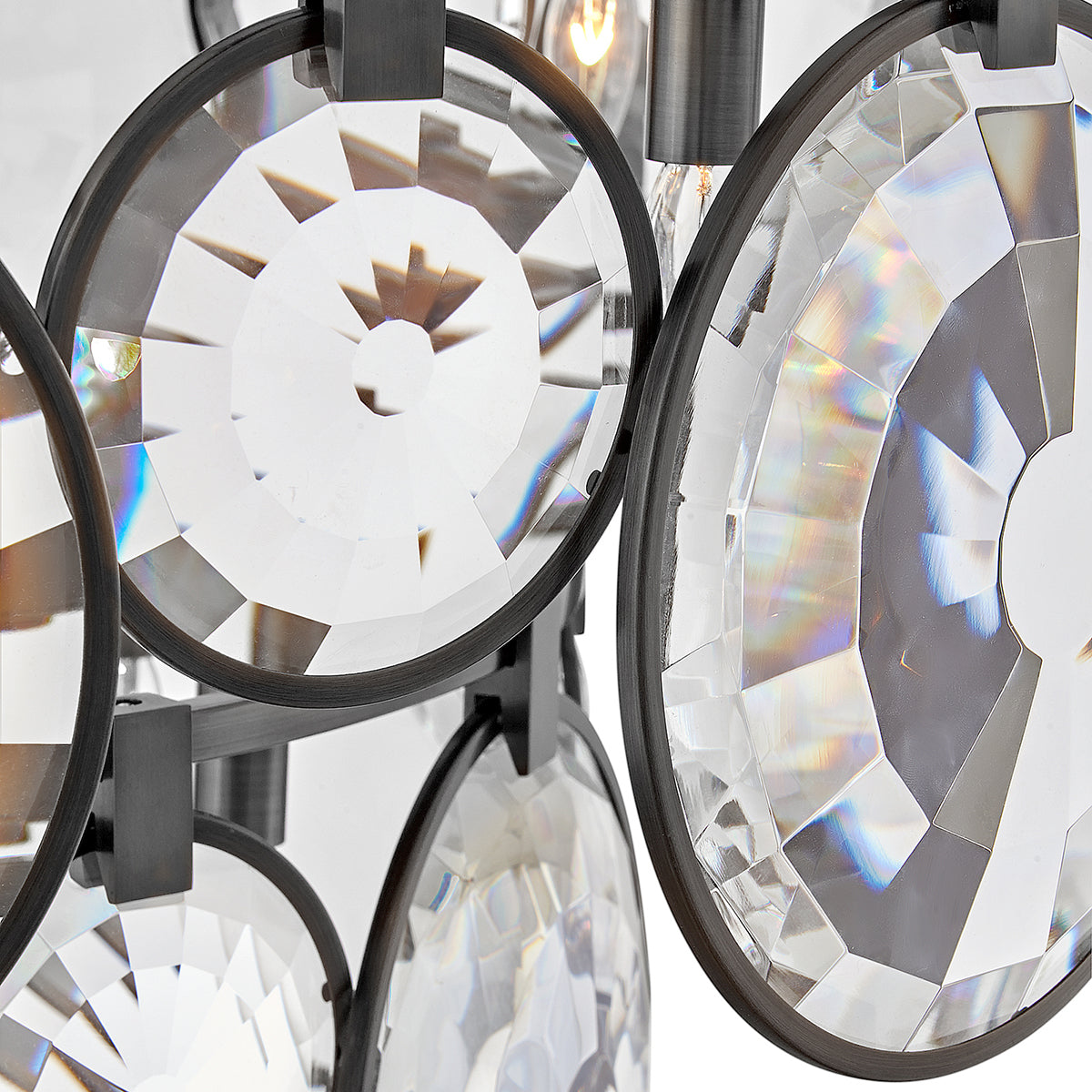 Nala is striking from any angle with a traditional silhouette and elegant eye-catching details. Multi-faceted, optic-crystal lenses surround the circular frame and attach with cast clips in Heritage Brass and Black finishes.